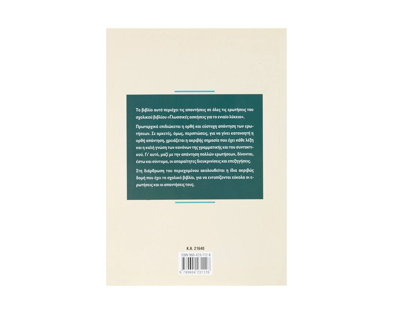 Το βιβλίο αυτό περιέχει τις απαντήσεις σε όλες τις ερωτήσεις του σχολικού βιβλίου «Γλωσσικές ασκήσεις για το Ενιαίο Λύκειο».