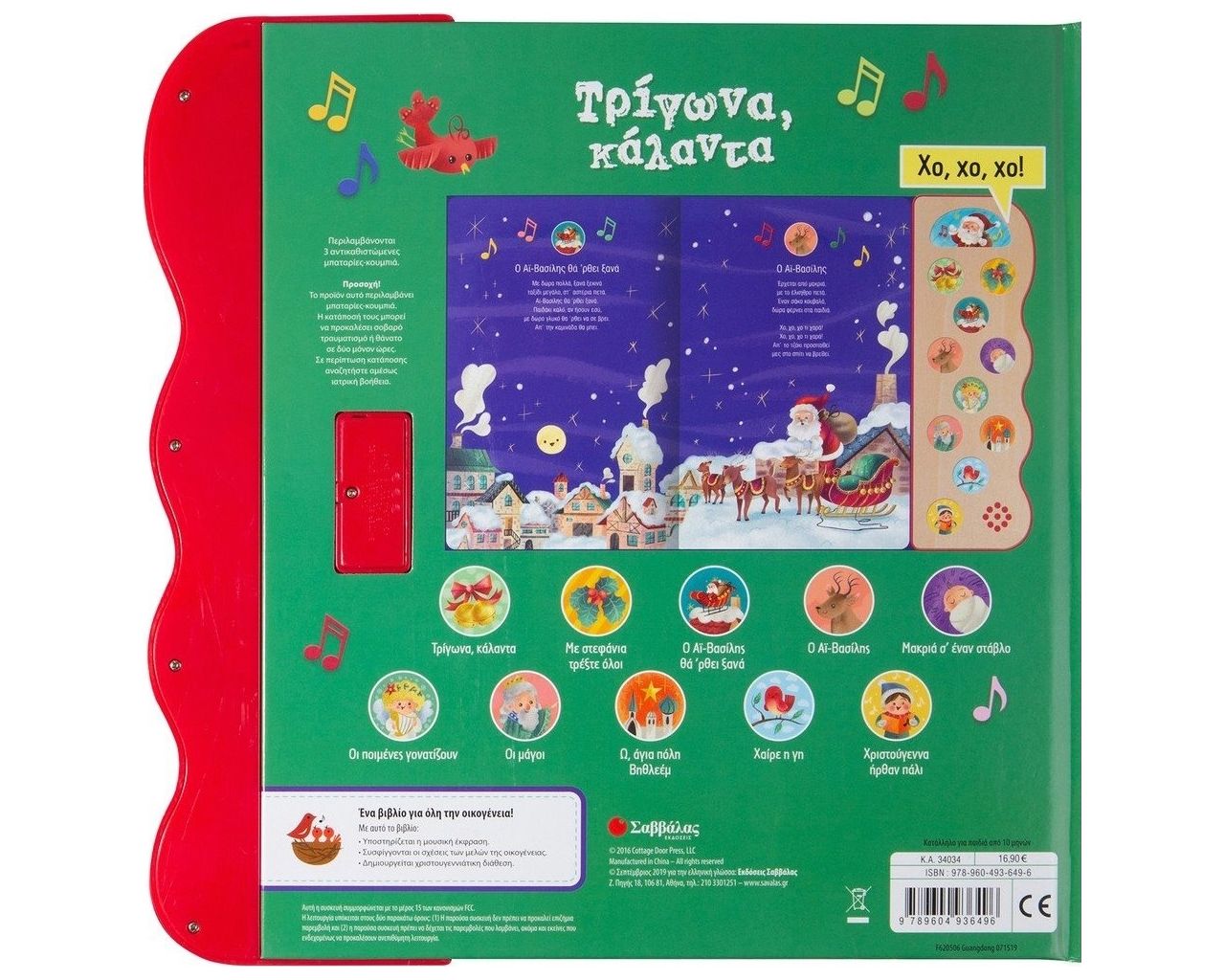 Ένα υπέροχο χριστουγεννιάτικο βιβλίο με πανέμορφη γιορτινή εικονογράφηση! Περιέχει τους στίχους και τη μουσική από 10 αγαπημένα Χριστουγεννιάτικα τραγούδια. Πατήστε το αντίστοιχο κουμπί και τραγουδήστε όλοι μαζί τα γιορτινά τραγούδια!