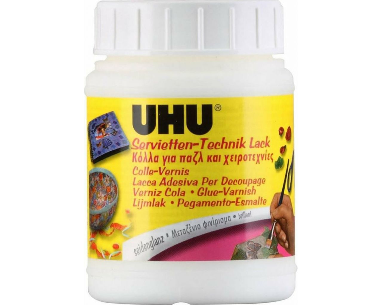 • Οδηγίες χρήσης Το UHU βερνίκι κόλλας είναι εύκολο να εφαρμοστεί με βούρτσα ή σφουγγάρι. Μόλις κόψετε το μοτίβο χαρτοπετσέτας και σηκώσετε την επάνω (τυπωμένη) στρώση, εφαρμόστε ένα βασικό στρώμα της κόλλας στο αντικείμενο και στη συνέχεια, τοποθετήστε το μοτίβο χαρτοπετσέτας πάνω στην κόλλα πριν στεγνώσει και προσεκτικά ισιώστε στη θέση του. Αφήστε να στεγνώσει για λίγο. Τελειώστε με την εφαρμογή κόλλας παντού. Αυτό δίνει την τελική πινελιά στο έργο τέχνης σας και το σφραγίζει επίσης. Φροντίστε ώστε το βερνίκι κόλλας UHU να μην εφαρμόζεται με μεγάλο πάχος, για να περιορίσετε τη συρρίκνωση χαρτιού. Εάν θέλετε να κάνετε κάτι από χαρτί ή κάρτα (π.χ. προσκλήσεις ή ευχετήριες κάρτες), εφαρμόστε μικρές κουκίδες του προϊόντος για να διορθώσετε τα μοτίβα στη θέση τους αντί να εφαρμόσετε μια βασική στρώση του προϊόντος.