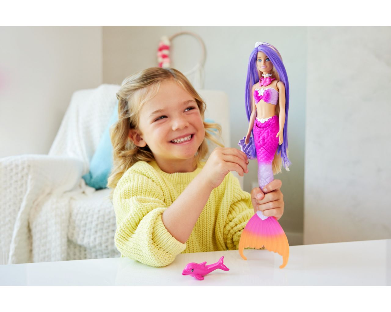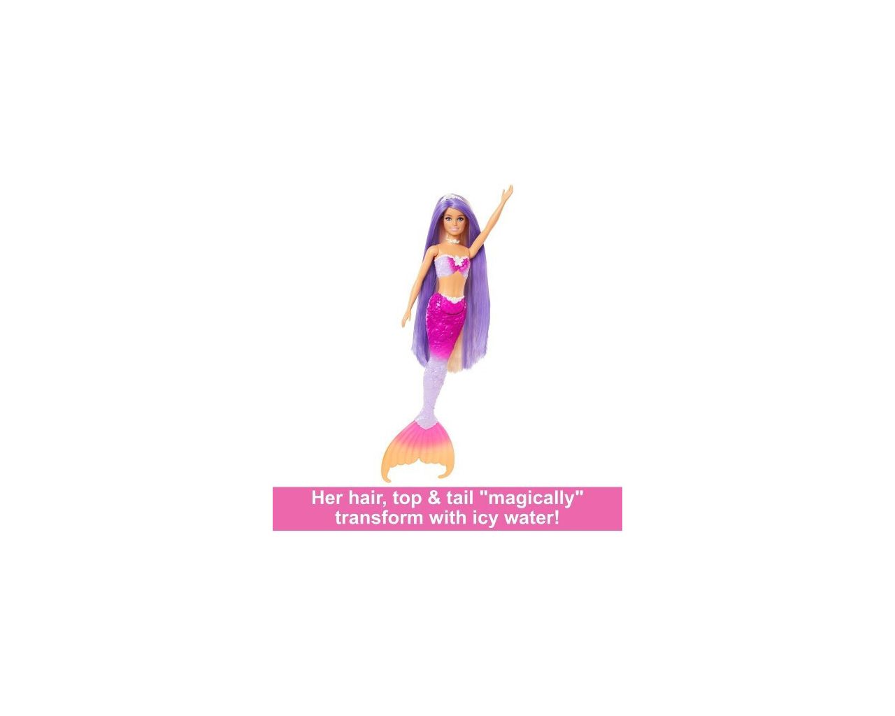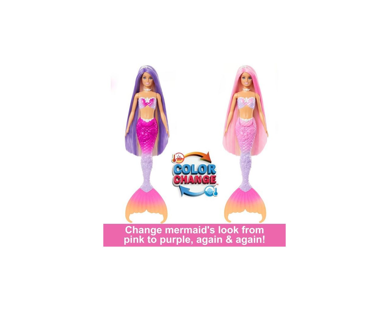 Αυτή η κούκλα Barbie γοργόνα μεταμορφώνεται κάνοντας το παιχνίδι μαγικό! Τα απίστευτα μακριά μαλλιά, το μπούστο με σχέδια και η όμπρε ουρά της αλλάζουν από ροζ σε μοβ, ξανά και ξανά.