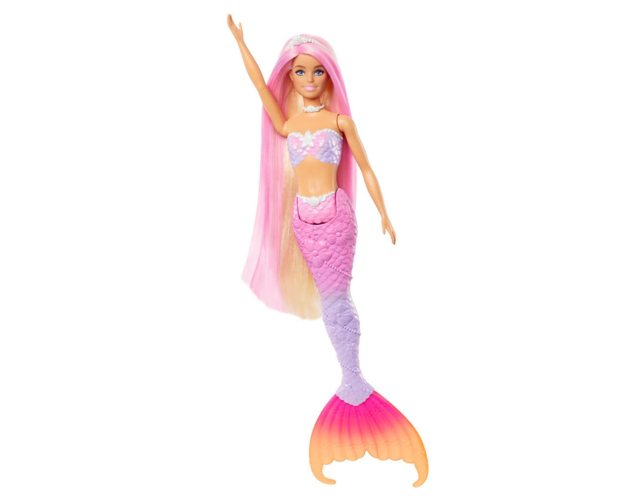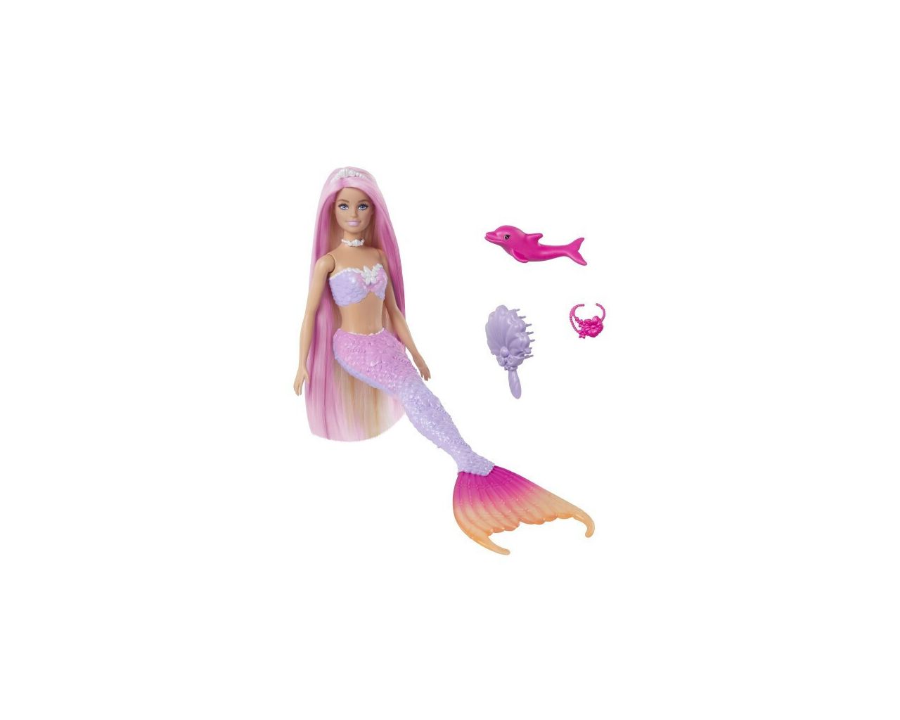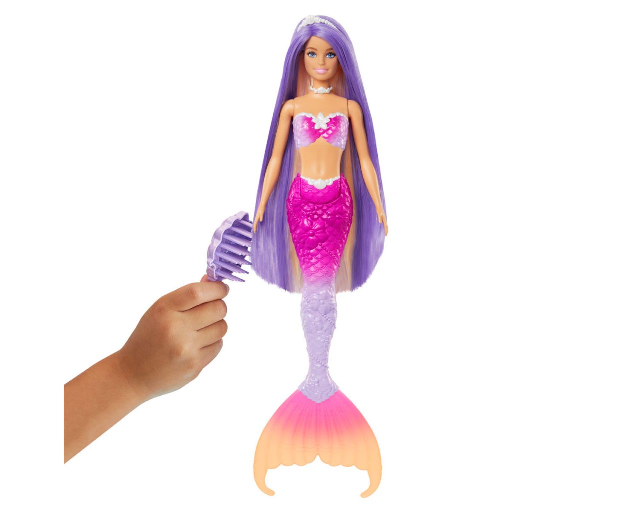 Αυτή η κούκλα Barbie γοργόνα μεταμορφώνεται κάνοντας το παιχνίδι μαγικό! Τα απίστευτα μακριά μαλλιά, το μπούστο με σχέδια και η όμπρε ουρά της αλλάζουν από ροζ σε μοβ, ξανά και ξανά.