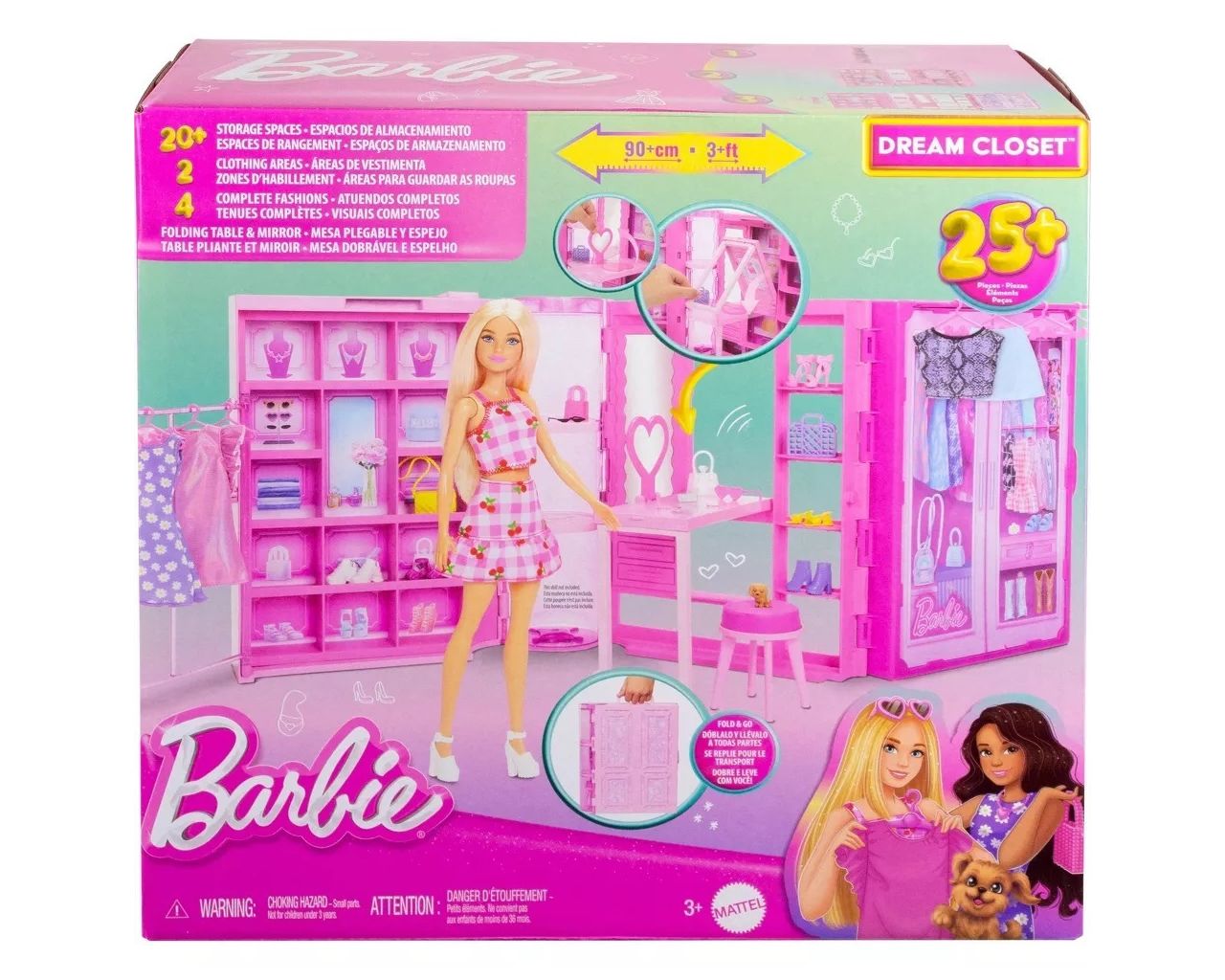 Αυτό το δωμάτιο της Barbie είναι γεμάτο με αμέτρητες ιστορίες που μπορούν να δημιουργήσουν τα παιδιά! Ανοίξτε το αστραφτερό ροζ δωμάτιο για να αποκαλύψετε ένα σετ παιχνιδιού πλάτους 91 εκ. με 2 κρεμάστρες ρούχων, 20 αποθηκευτικούς χώρους, μία πτυσσόμενη τουαλέτα ομορφιάς με καθρέφτη, έναν ολόσωμο καθρέφτη και ράφι παπουτσιών. Υπάρχει ακόμη και κάθισμα για το σκυλάκι. Κατάλληλο για παιδιά ηλικίας 3+ ετών. Τα παιδιά θα λατρέψουν να ντύνουν με διαφορετικά στιλ την Barbie (πωλείται ξεχωριστά) με τα 25 ρούχα και αξεσουάρ, που περιλαμβάνουν φορέματα, παπούτσια, κολιέ και τσαντάκια! Συνδυάστε 3 ολοκληρωμένα σύνολα και εμπνευστείτε αμέτρητες ιστορίες! Τα παιδιά μπορούν να βοηθήσουν την Barbie να διαλέξει ένα ρούχο στο ράφι, να δώσει έξτρα στιλ με αξεσουάρ στον καθρέφτη και μετά να ολοκληρώσει την προετοιμασία της στην τουαλέτα ομορφιάς πριν βγει βόλτα με το σκυλάκι της! Για εύκολη αποθήκευση, όλα τα κομμάτια χωρούν στο εσωτερικό του δωματίου που έχει ροζ λαβή Barbie για εύκολη μεταφορά!