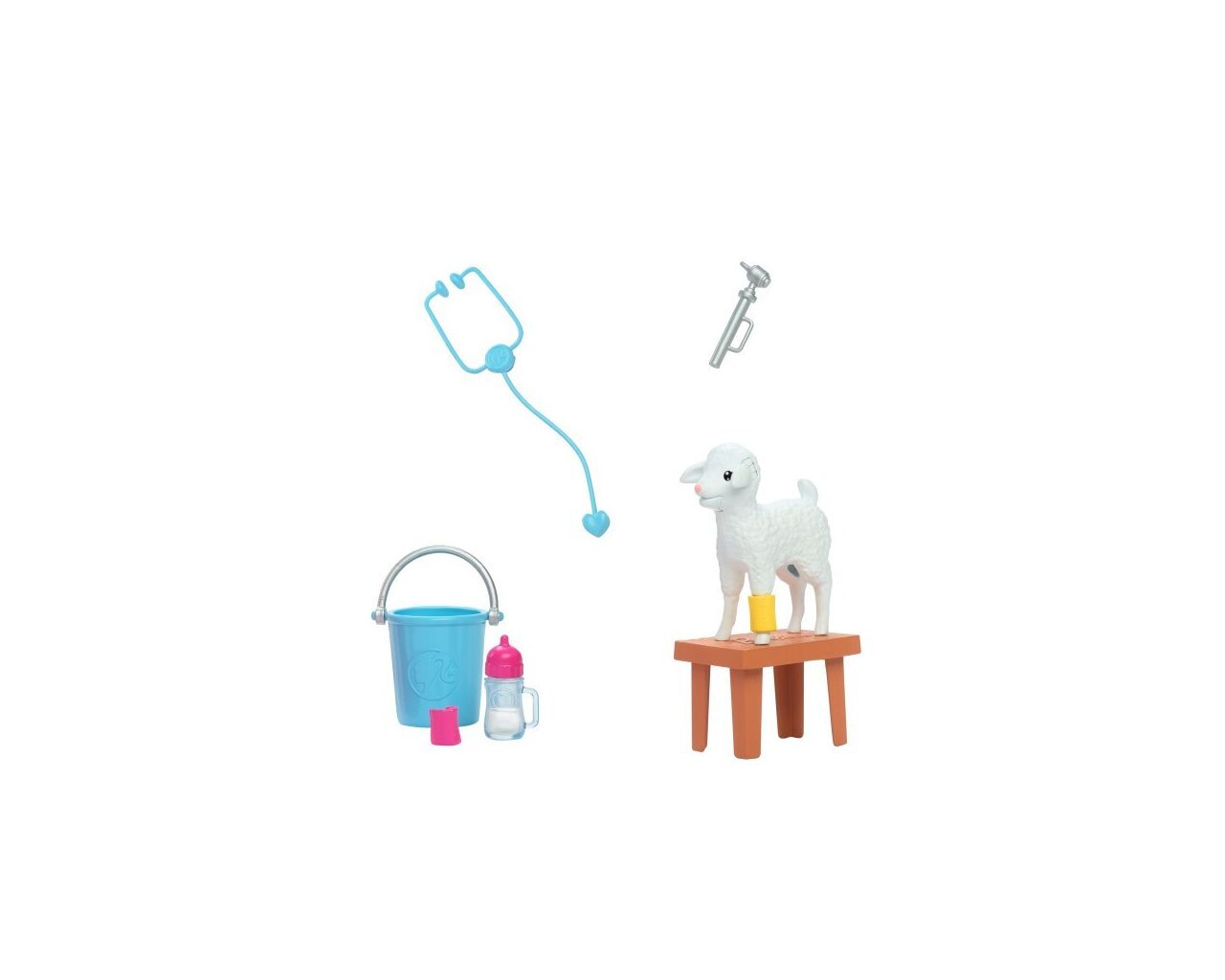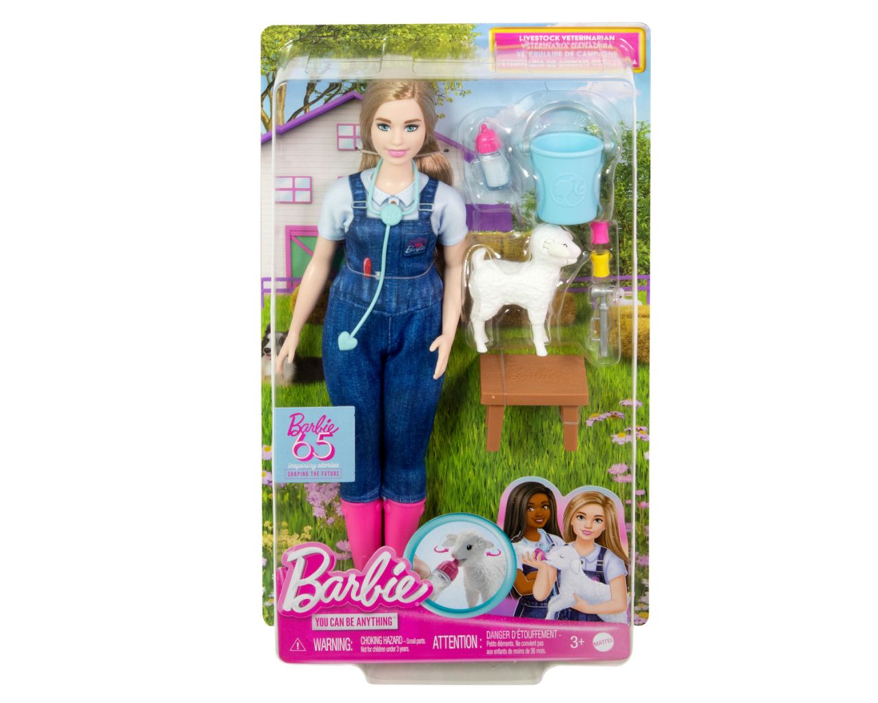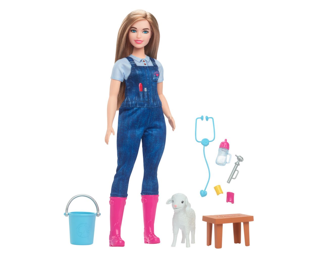 Η κούκλα Barbie Κτηνίατρος φοράει ολόσωμη φόρμα εργασίας, με ροζ μπότες και έχει 10 θεματικά αξεσουάρ, μεταξύ των οποίων και ένα αρνάκι που κουνάει τα αυτάκια του!