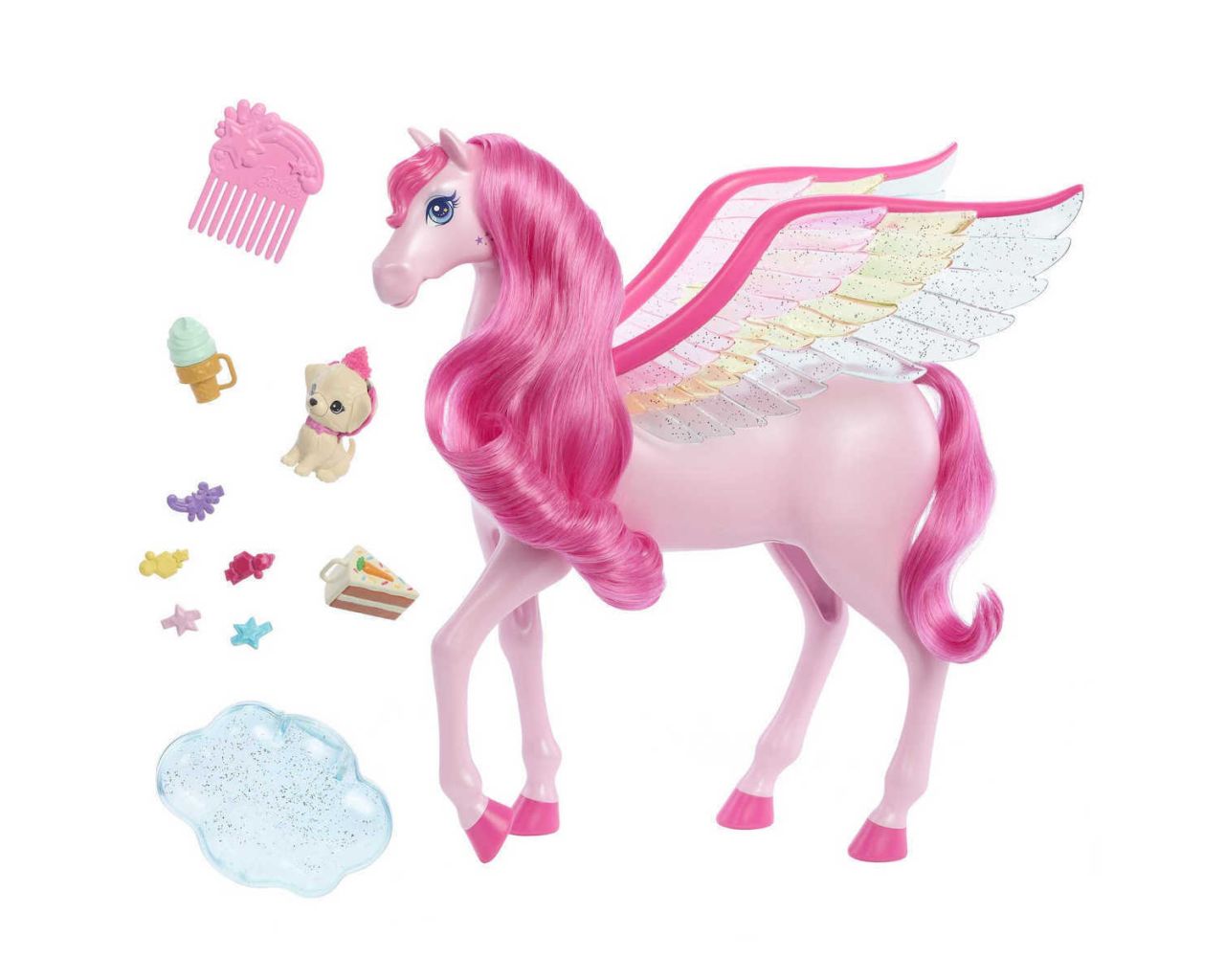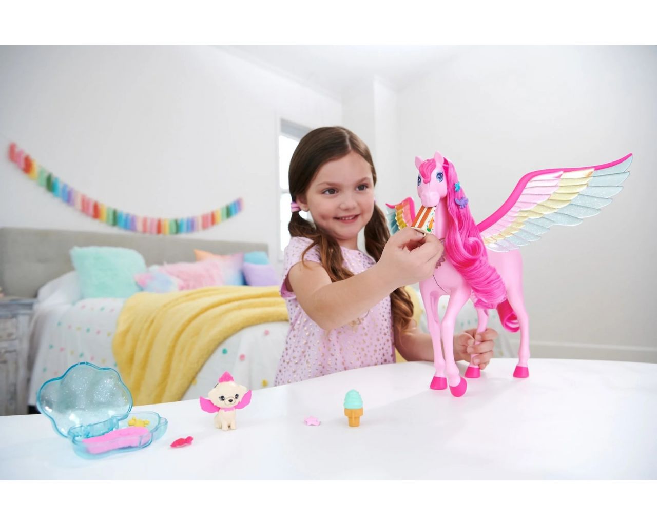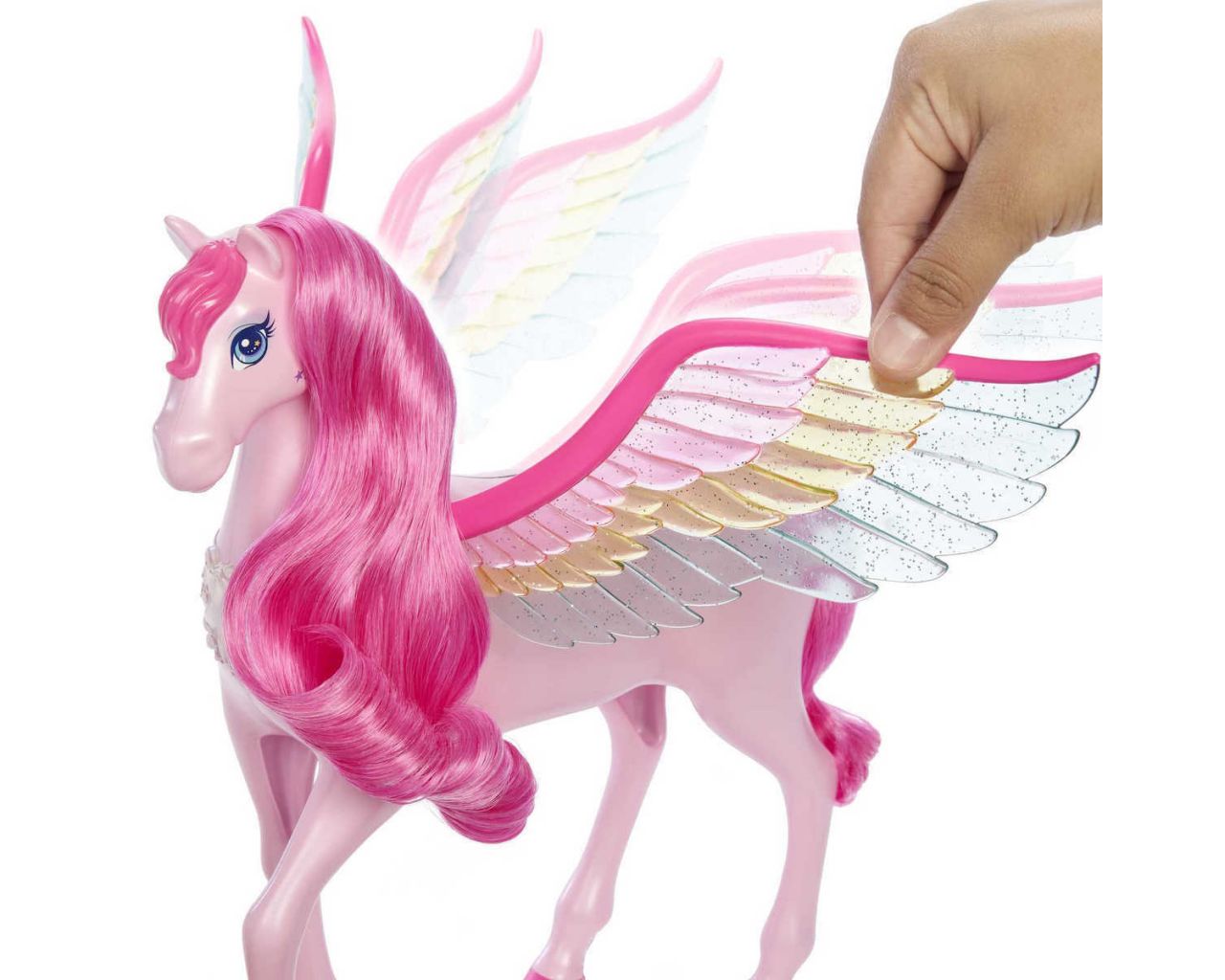 Τα παιδιά μπορούν να παίξουν τις αγαπημένες τους σκηνές από το Barbie A Touch of Magic ή να δημιουργήσουν δικές τους φανταστικές περιπέτειες. Ο Πήγασος διαθέτει φώτα ουράνιου τόξου και ήχους που ενεργοποιούνται με διάφορους τρόπους. Έρχεται επίσης με ένα μαγικό κουτάβι και αξεσουάρ! Τα χρώματα και τα διακοσμητικά μπορεί να διαφέρουν. Τα παιδιά μπορούν να πατήσουν το κολιέ της ή να κινήσουν τα φτερά της για να δουν τα φώτα του ουράνιου τόξου και να ακούσουν μαγικούς ήχους, συμπεριλαμβανομένου του θεματικού τραγουδιού Barbie A Touch of Magic.