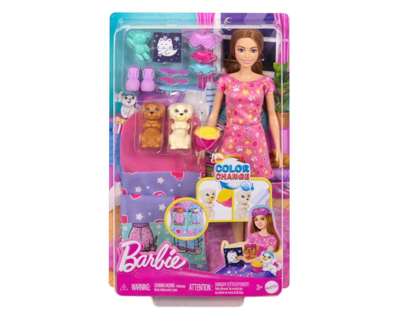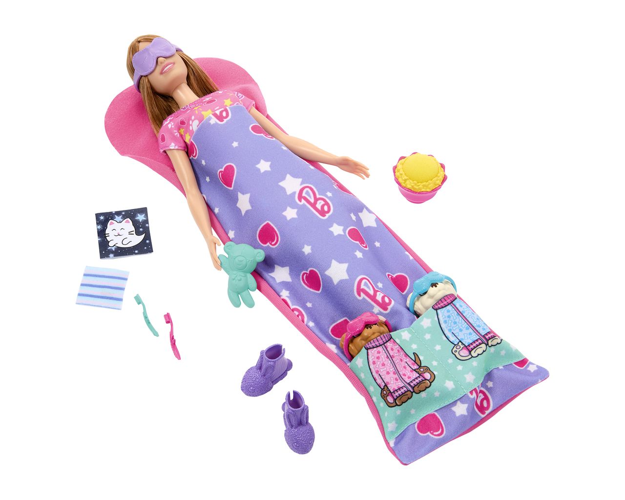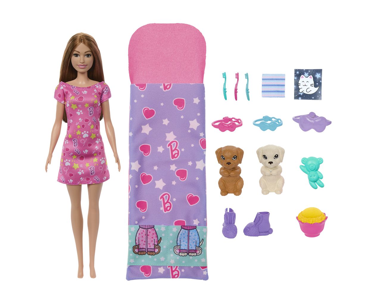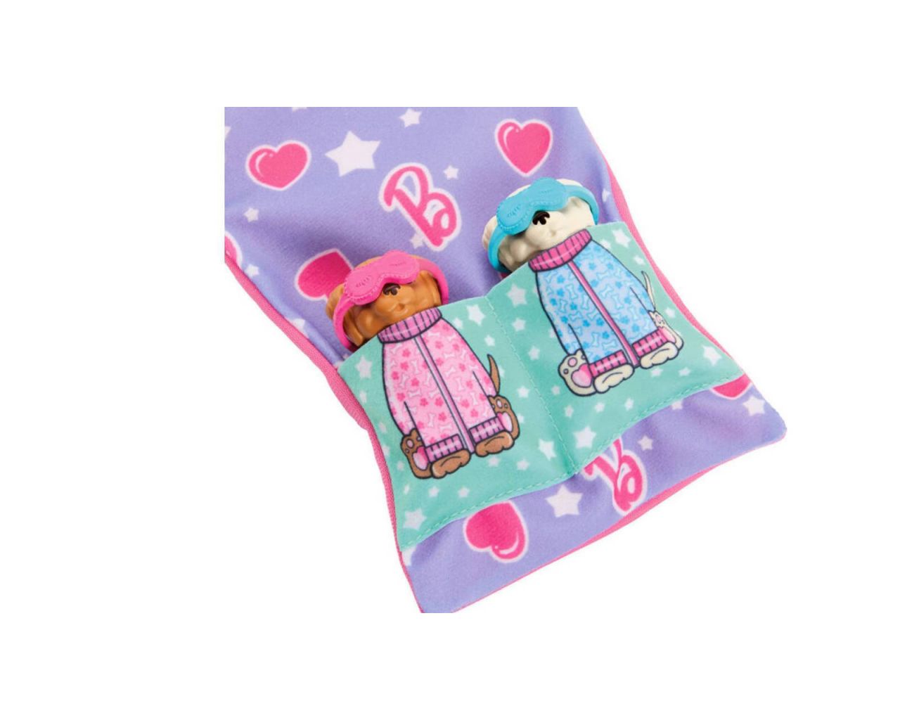 Η Barbie είναι έτοιμη για ένα ονειρεμένο sleepover με κουταβάκια! Αυτό το σετ παιχνιδιού περιλαμβάνει μία κούκλα Barbie, δύο αξιολάτρευτα κουταβάκια, υπνόσακο που χωράει και τους τρεις, και 10 αξεσουάρ.