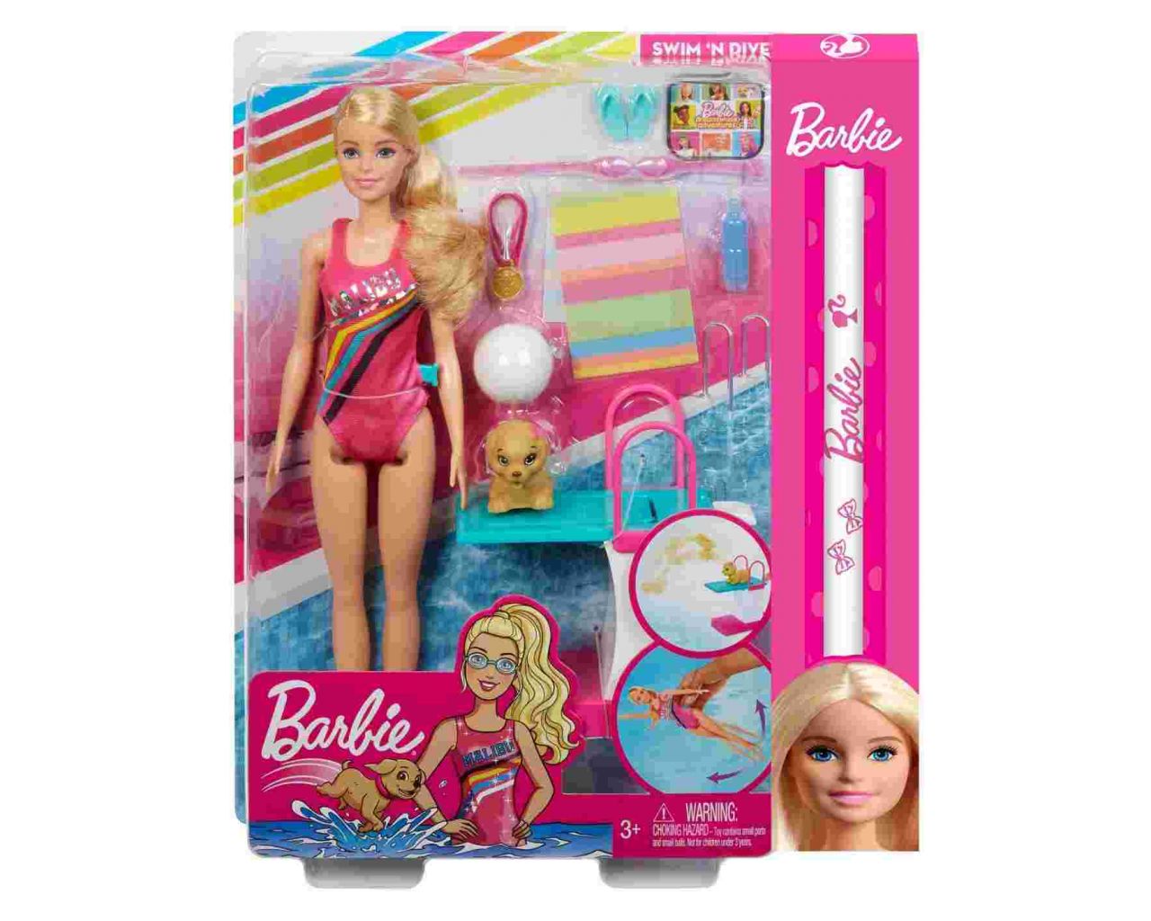 - Τα παιδιά θα δημιουργήσουν πολλές ιστορίες με την Barbie Κολυμβήτρια που φοράει ένα πολύχρωμο μαγιό με αθλητικές ρίγες και ασημί λεπτομέρειες.