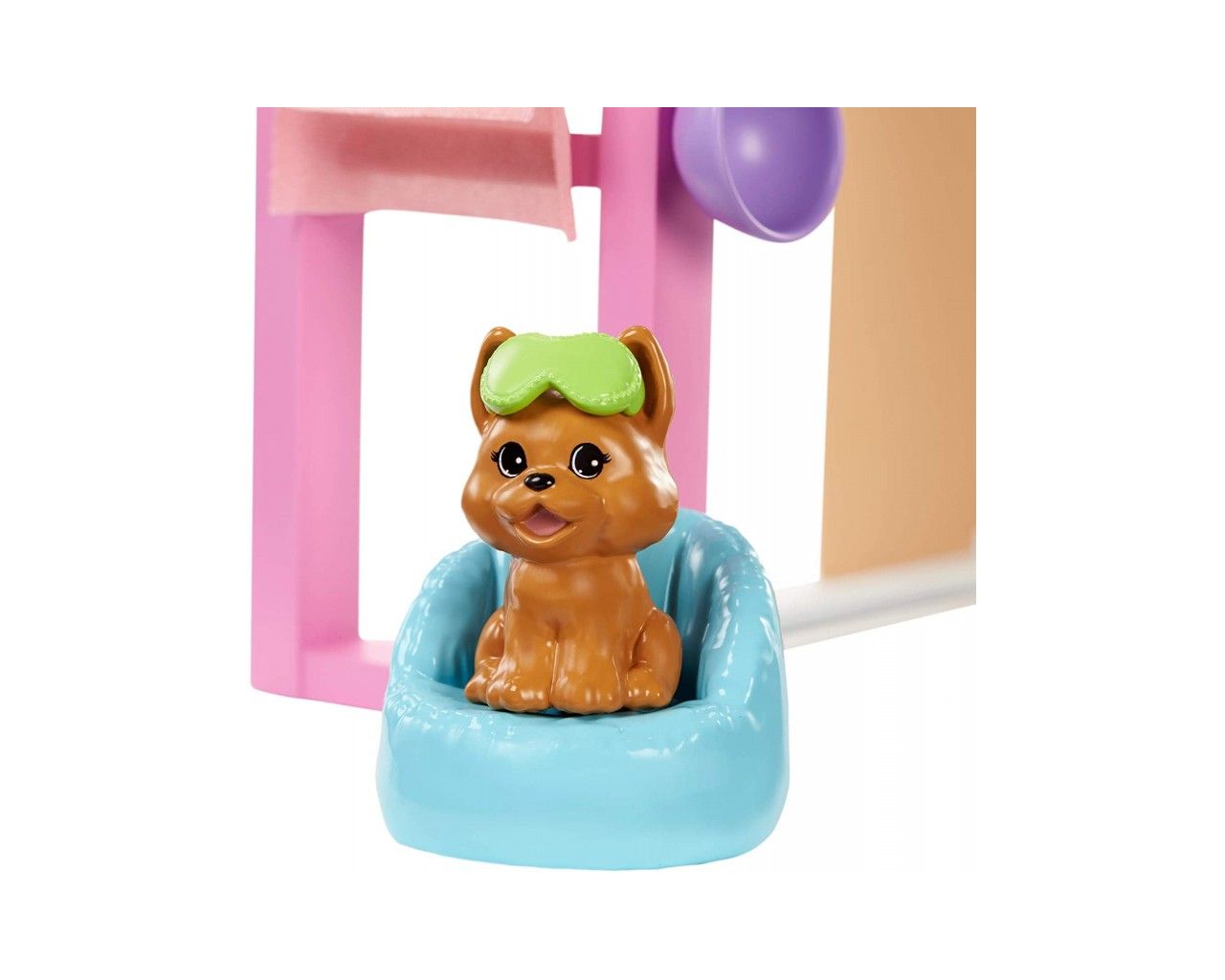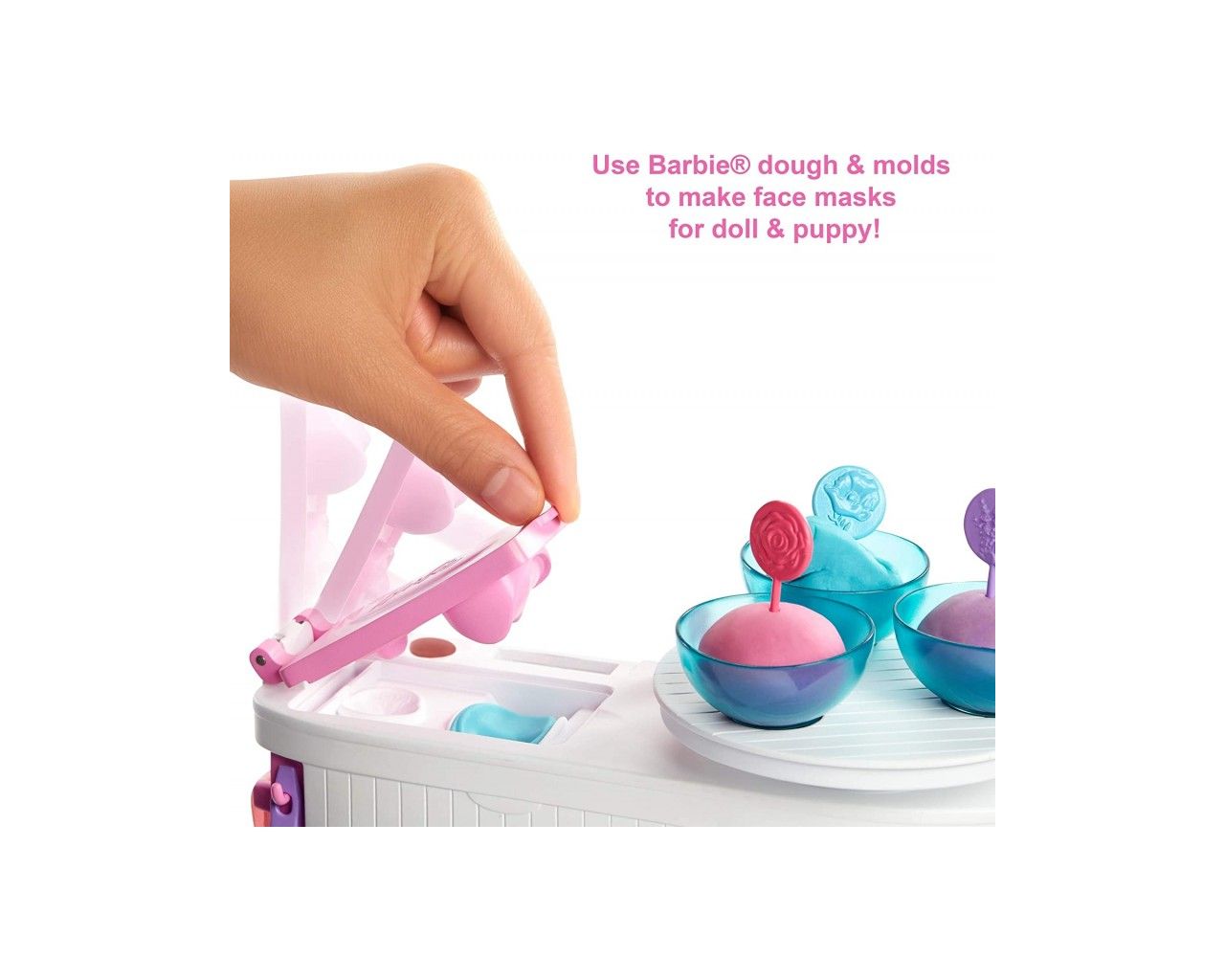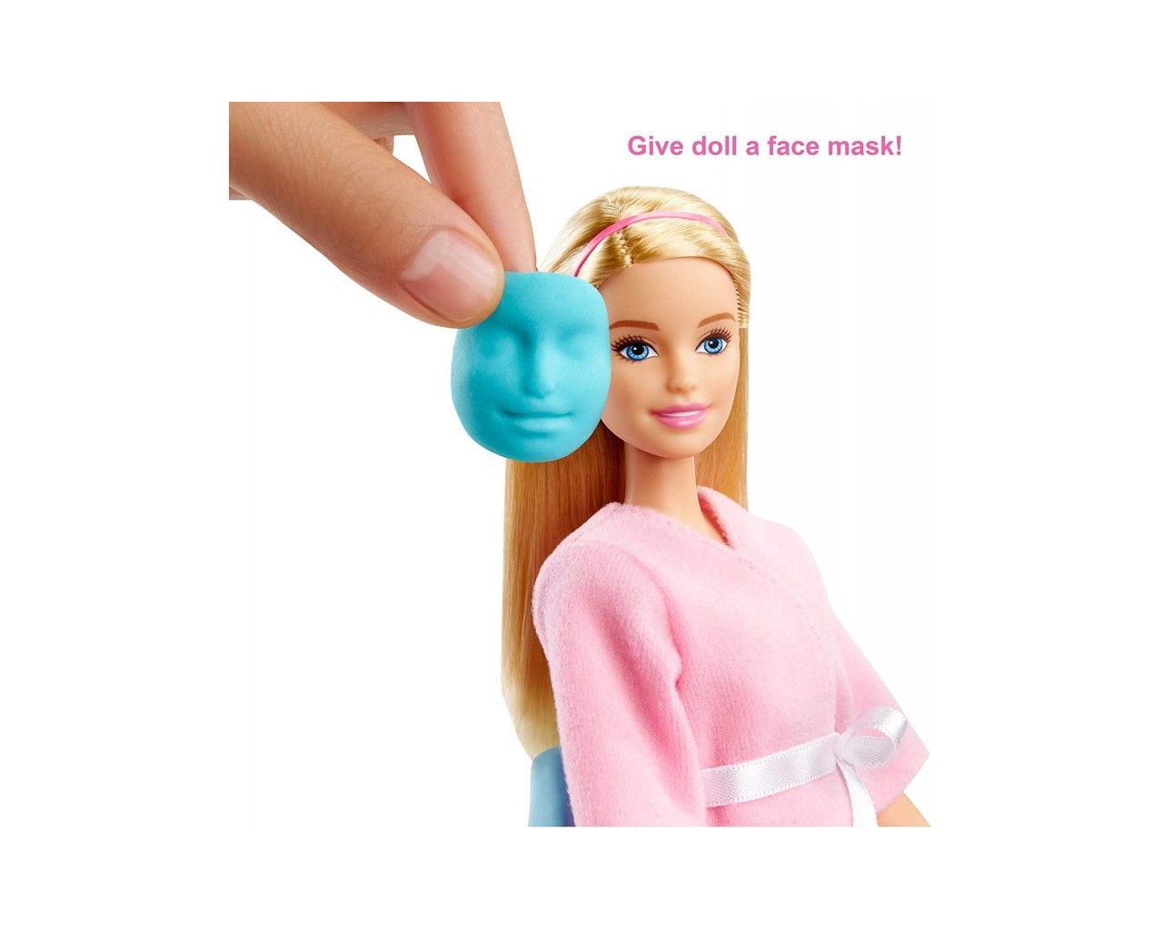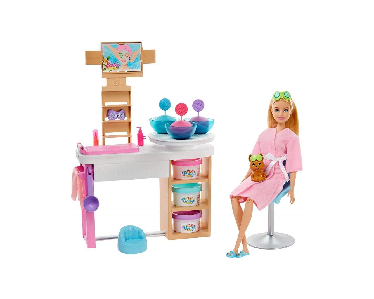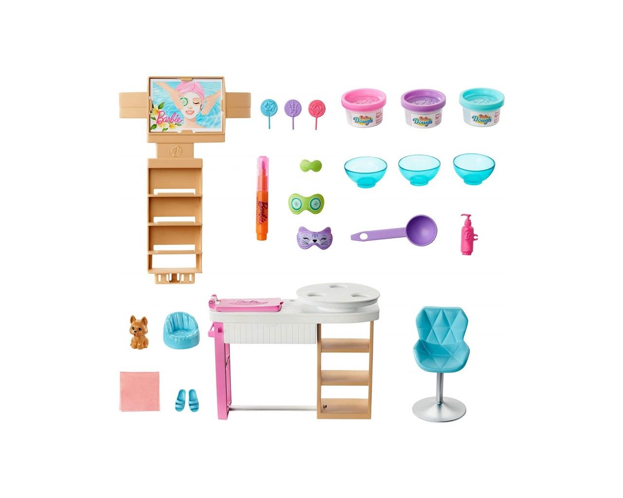 - Το σετ προσώπου spa περιλαμβάνει κούκλα Barbie που φοράει ρόμπα και παπούτσια, κουτάβι, σταθμό σπα με χώρο αποθήκευσης και καλούπια, τρεις μπανιέρες ζύμης Barbie, κηλίδα, μια καρέκλα, ένα κρεβάτι για κατοικίδια και αξεσουάρ .