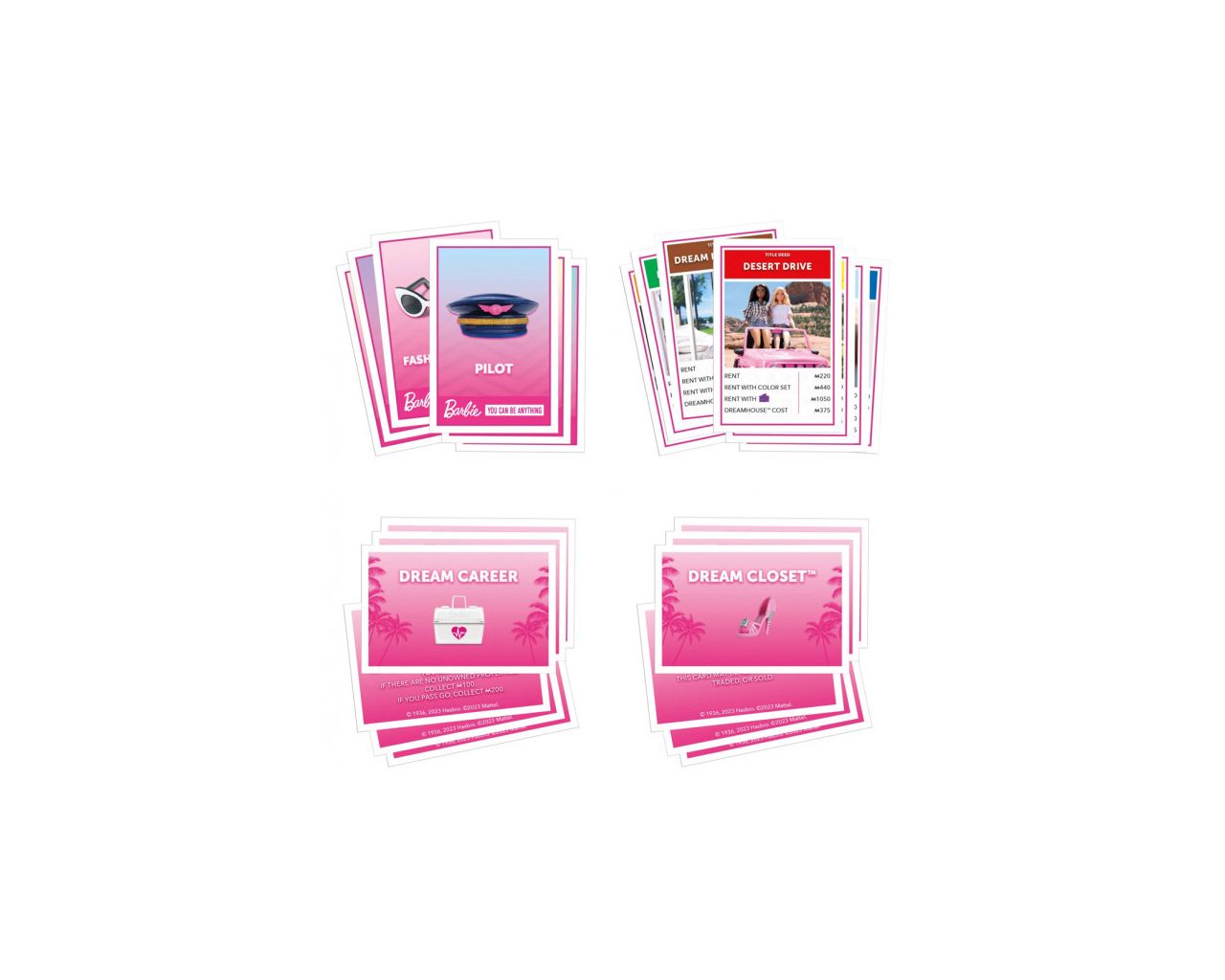Γίνε οτιδήποτε με την Barbie! Με το επιτραπέζιο παιχνίδι Monopoly: Barbie Edition, οι παίκτες μπορούν να φανταστούν ότι μπαίνουν σε ροζ παπούτσια Barbie καθώς ακολουθούν τα όνειρά τους για να τα έχουν όλα! Πρώτα, κάθε παίκτης επιλέγει μια κάρτα Be Anything για να επιλέξει από 6 καριέρες Barbie. Στη συνέχεια ταξιδεύουν στον πίνακα με ένα ροζ κουπόνι Barbie για να αγοράσουν δρόμους στον κόσμο των ονείρων Barbie τους — και να τους φτιάξουν με DreamHouses! Αν ρίξουν ένα "B" με το ζάρι Barbie, μπορούν να αναπτύξουν τη μοναδική τους ικανότητα στο Be Anything, δίνοντάς τους ένα πλεονέκτημα έναντι των αντιπάλων. Ζήστε τους στόχους καριέρας και μόδας τραβώντας κάρτες Dream Career και Dream Closet. Ακόμη και διάσημα οχήματα Barbie, όπως το Dream Camper της, εμφανίζονται στους χώρους μεταφοράς. ταξιδέψτε στον επόμενο χώρο μεταφοράς με στυλ. Ο παίκτης με τον μεγαλύτερο κόσμο Barbie κερδίζει! Αυτό το διασκεδαστικό επιτραπέζιο παιχνίδι για παιδιά και ενήλικες είναι ένα εξαιρετικό παιχνίδι για οικογενειακούς χρόνους, διακοπές και πολλά άλλα. Και αυτό το συναρπαστικό παιχνίδι εσωτερικού χώρου είναι ένα εξαιρετικό δώρο για οικογένειες και παιδιά ηλικίας 8+ που αγαπούν τις κούκλες Barbie και τα επιτραπέζια παιχνίδια Monopoly.
