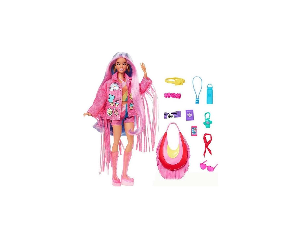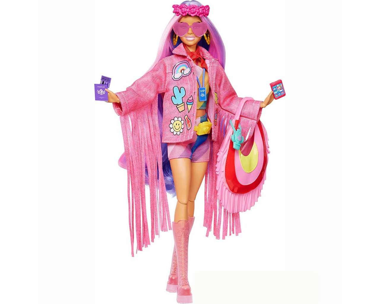 Oι κούκλες Barbie Extra Fly ταξιδεύουν με στιλ, έχοντας εντυπωσιακές εμφανίσεις για διαφορετικούς προορισμούς! Κάθε κούκλα είναι ευλύγιστη και έχει τη δική της μοναδική εμφάνιση με ρούχα κατάλληλα για μία εκδρομή στο χιόνι, στην έρημο, στην παραλία ή για σαφάρι. Με αξεσουάρ με θέμα τα ταξίδια, όπως μεγάλες τσάντες και διαβατήρια, που ενθαρρύνουν τα παιδιά να εμπνευστούν πολλές ιστορίες και να εκφραστούν! Κάθε κούκλα πωλείται ξεχωριστά, ανάλογα με τη διαθεσιμότητα. Οι κούκλες Barbie δεν μπορούν να σταθούν όρθιες μόνες τους. Οι κούκλες Barbie Extra Fly είναι έτοιμες για διακοπές με εντυπωσιακά ρούχα και έξτρα στιλ! Κάθε κούκλα έχει ταξιδιωτικά αξεσουάρ και κομμάτια μόδας που ξεχωρίζουν. Η Barbie είναι κατάλληλα ντυμένη για μία συναυλία στην έρημο! Με ευλύγιστο σώμα για να παίρνει πολλές διαφορετικές πόζες. Επιδεικνύει το στιλ της με αυτοπεποίθηση με μακριά ροζ και μοβ μαλλιά, ροζ τζιν τζάκετ με κρόσια και σχέδια, πολύχρωμα ρούχα και ροζ μπότες.