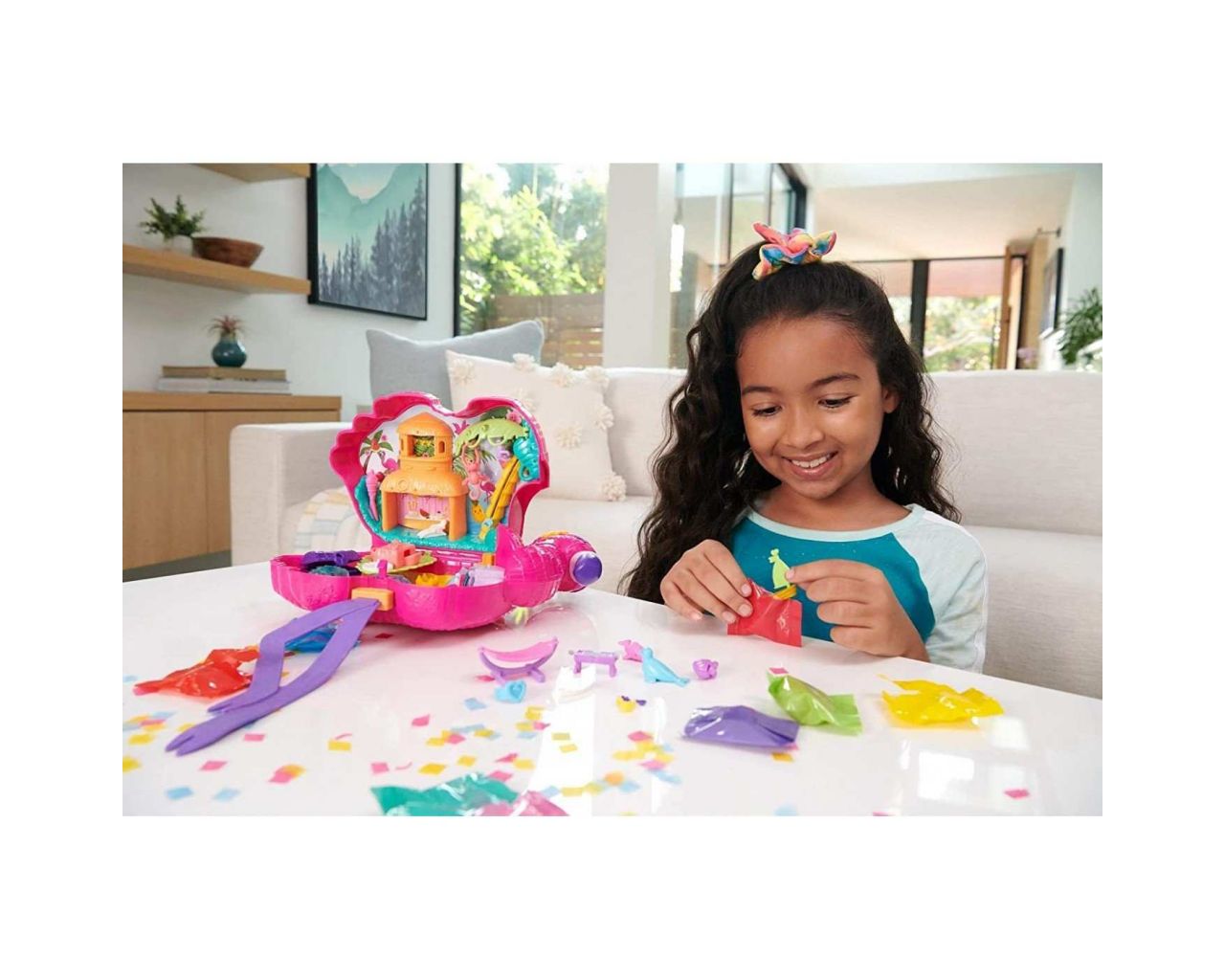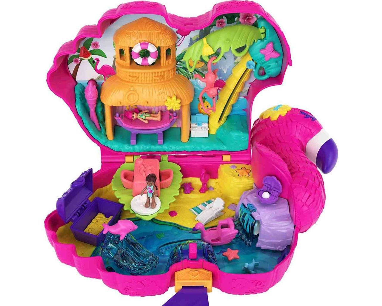 Ένα διασκεδαστικό πάρτι εκπλήξεων με την Polly Pocket! Σε σχήμα φλαμίνγκο, αυτό το μεγάλο σετ έχει λαβή για να το παίρνετε μαζί σας. Τραβήξτε τις προεξοχές και δείτε το πολύχρωμο κομφετί και πάνω από 26 εκπλήξεις να πέφτουν από το σετ! Μερικές ακόμα εκπλήξεις περιμένουν να τις ανακαλύψετε! Ορισμένα αξεσουάρ έχουν προεξοχή για να συνδέονται σε διαφορετικά σημεία του σετ. Το σετ ανοίγει για να αποκαλύψετε διαφορετικά σημεία παιχνιδού και να διασκεδάσετε μαζί με τις δύο φίλες. Υπάρχουν τόσα πολλά διασκεδαστικά πράγματα να κάνετε και να εξερευνήσετε: συνδέστε μια κούκλα στον κορμό του φοίνικα για να σκαρφαλώσει πάνω-κάτω. Συνδέστε τη μαϊμού στο δέντρο και την κούκλα στη μαϊμού και να κουνηθεί. Γυρίστε το μεγάλο φύλλο στην καλύβα για να αποκαλύψετε έναν χώρο διασκέδασης και μια περιστρεφόμενη πίστα χορού. Το σεντούκι του θησαυρού ανοίγει και έχει αποθηκευτικό χώρο. Συνδέστε αξεσουάρ στην οροφή της καλύβας, στην κορυφή του δέντρου, στην παραλία και στο νερό. Τοποθετήστε τη σανίδα του σερφ, το φουσκωτό φλαμίνγκο και το δελφίνι στο κύμα. Υπάρχουν τόσες πολλές εκπλήξεις και ατελείωτες δυνατότητες παιχνιδιού!