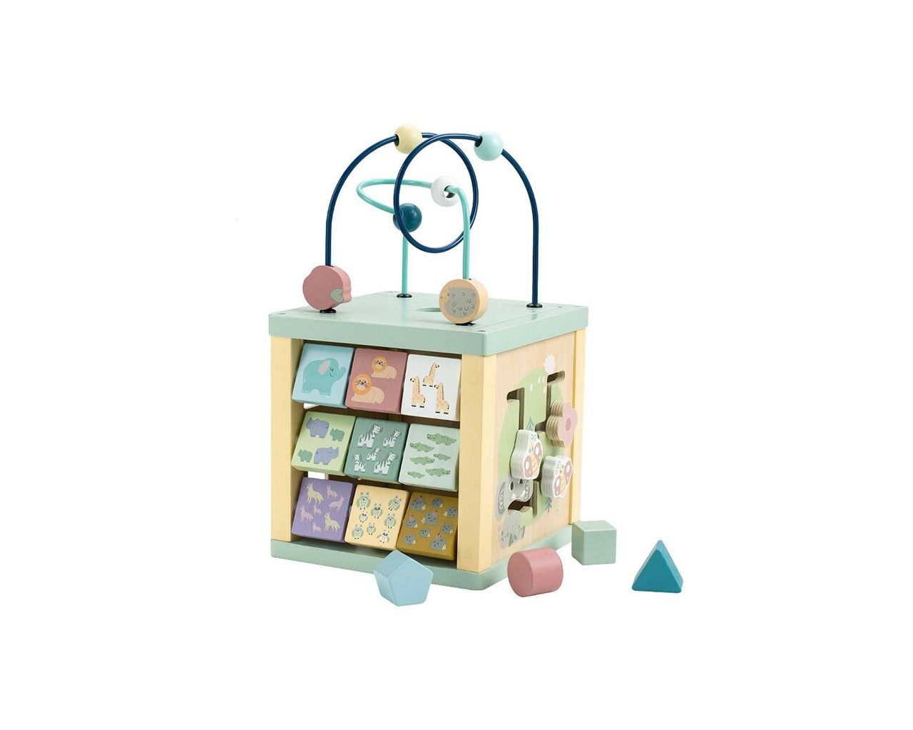 Ο ξύλινος κύβος δραστηριοτήτων, κατασκευασμένος από υψηλής ποιότητας ξύλο, προσφέρει διάφορες δραστηριότητες σε κάθε πλευρά του και έρχεται σε παστέλ αποχρώσεις.