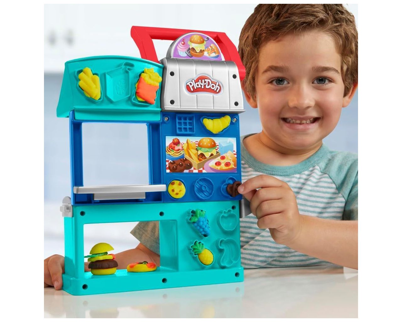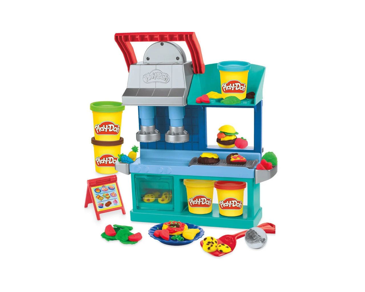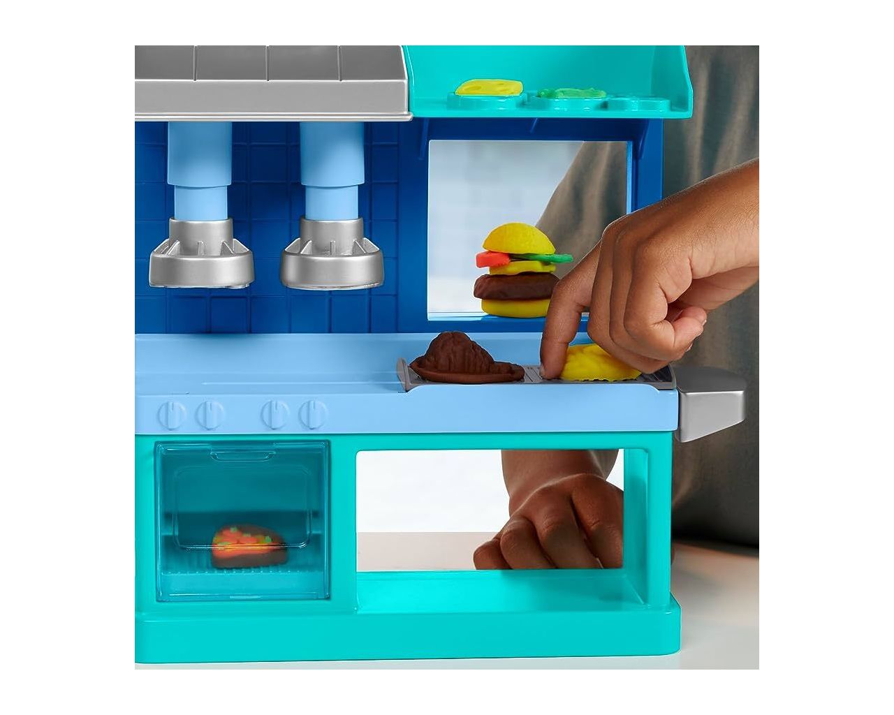 Το Play-Doh Kitchen Creations Busy Chef's Restaurant Playset επιτρέπει στα παιδιά να αισθάνονται ότι έχουν το δικό τους εστιατόριο καθώς δημιουργούν, προσαρμόζουν και μοιράζονται εκπληκτικές δημιουργίες τροφίμων Play-Doh! Τα παιδιά μπορούν εύκολα να κολλήσουν τα stamper για να φτιάξουν προσποιητή πίτσα, μπιφτέκια, ζυμαρικά ή κοτόπουλο και να πατήσουν το μοχλό για να σφραγίσουν 2 φαγητά που παίζουν τη φορά! Στη συνέχεια, παρακολουθήστε το ταψί να γλιστράει προς το σταθμό προετοιμασίας καθώς απελευθερώνουν το μοχλό! Δημιουργήστε καλούπια για μπέργκερ, φανταστικές πατάτες, τρελά μπισκότα και άλλα φαγητά χρησιμοποιώντας τα μισά καλούπια και στις δύο πλευρές αυτού του παιδικού σετ παιχνιδιού.