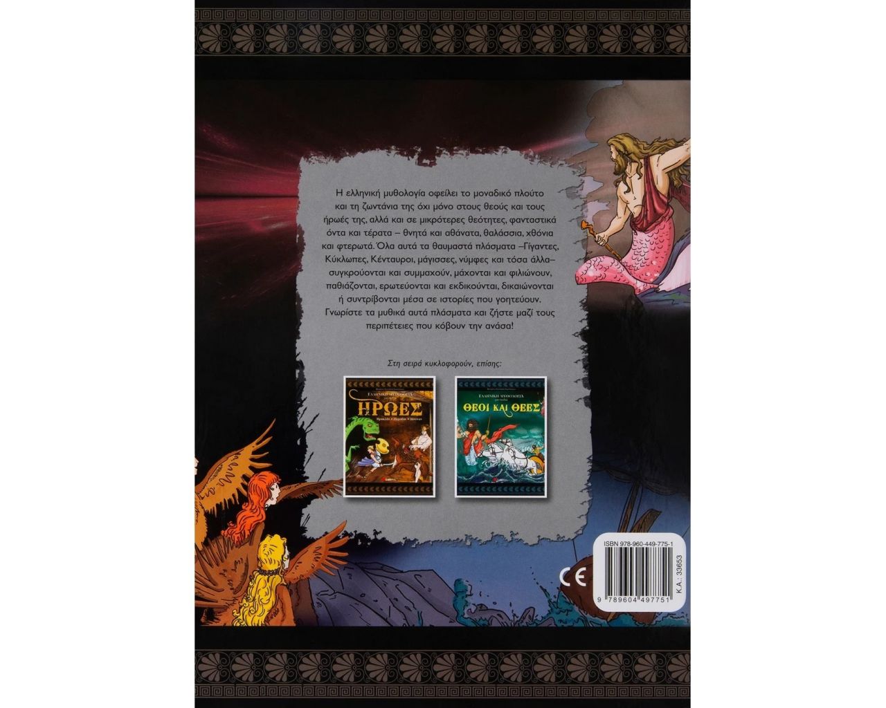 Η ελληνική μυθολογία οφείλει το μοναδικό πλούτο και τη ζωντάνια της όχι μόνο στους θεούς και τους ήρωές της, αλλά και, σε μικρότερες θεότητες, φανταστικά και τέρατα - θνητά και αθάνατα, θαλάσσια, χθόνια και φτερωτά. Όλα αυτά τα θαυμαστά πλάσματα -Γίγαντες, Κύκλωπες, Κένταυροι, μάγισσες, νύμφες και, τόσα άλλα- συγκρούονται και συμμαχούν, μάχονται και φιλιώνουν, παθιάζονται, ερωτεύονται και εκδικούνται, δικαιώνονται ή συντρίβονται μέσα σε ιστορίες που γοητεύουν. Γνωρίστε τα μυθικά αυτά πλάσματα και ζήστε μαζί τους περιπέτειες που κόβουν την ανάσα!