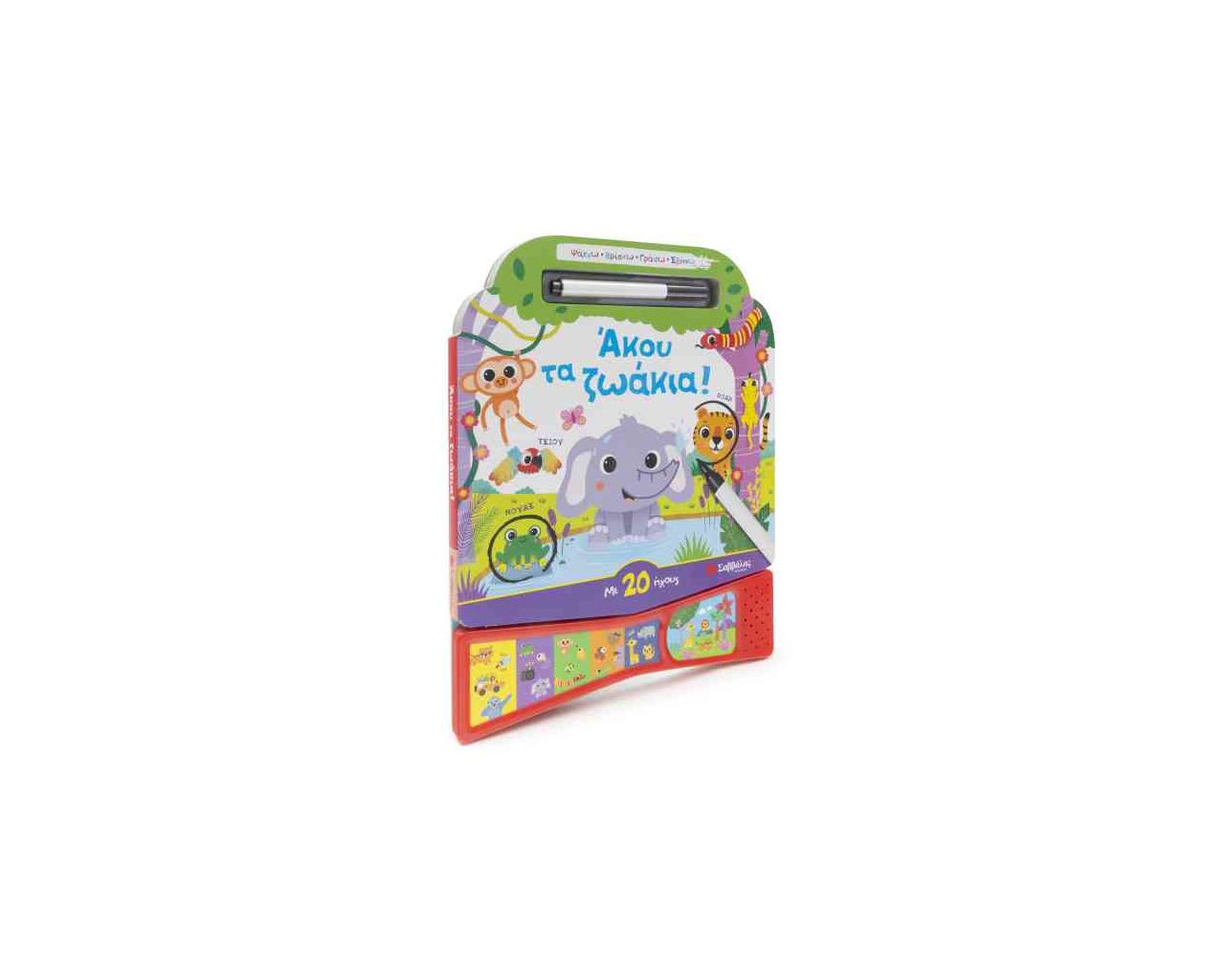 - Ποιος κάνει ΡΟΑΡ και ποιος ΚΟΥΑΞ ΚΟΥΑΞ; Ποιος ουρλιάζει και ποιος βρυχάται; Άκουσε τους ήχους και μετά βρες και κύκλωσε με τον μαρκαδόρο όλα αυτά που βγάζουν τους ήχους που άκουσες! Ανακάλυψε 20 ήχους σ’ αυτό το διασκεδαστικό διαδραστικό βιβλίο.
