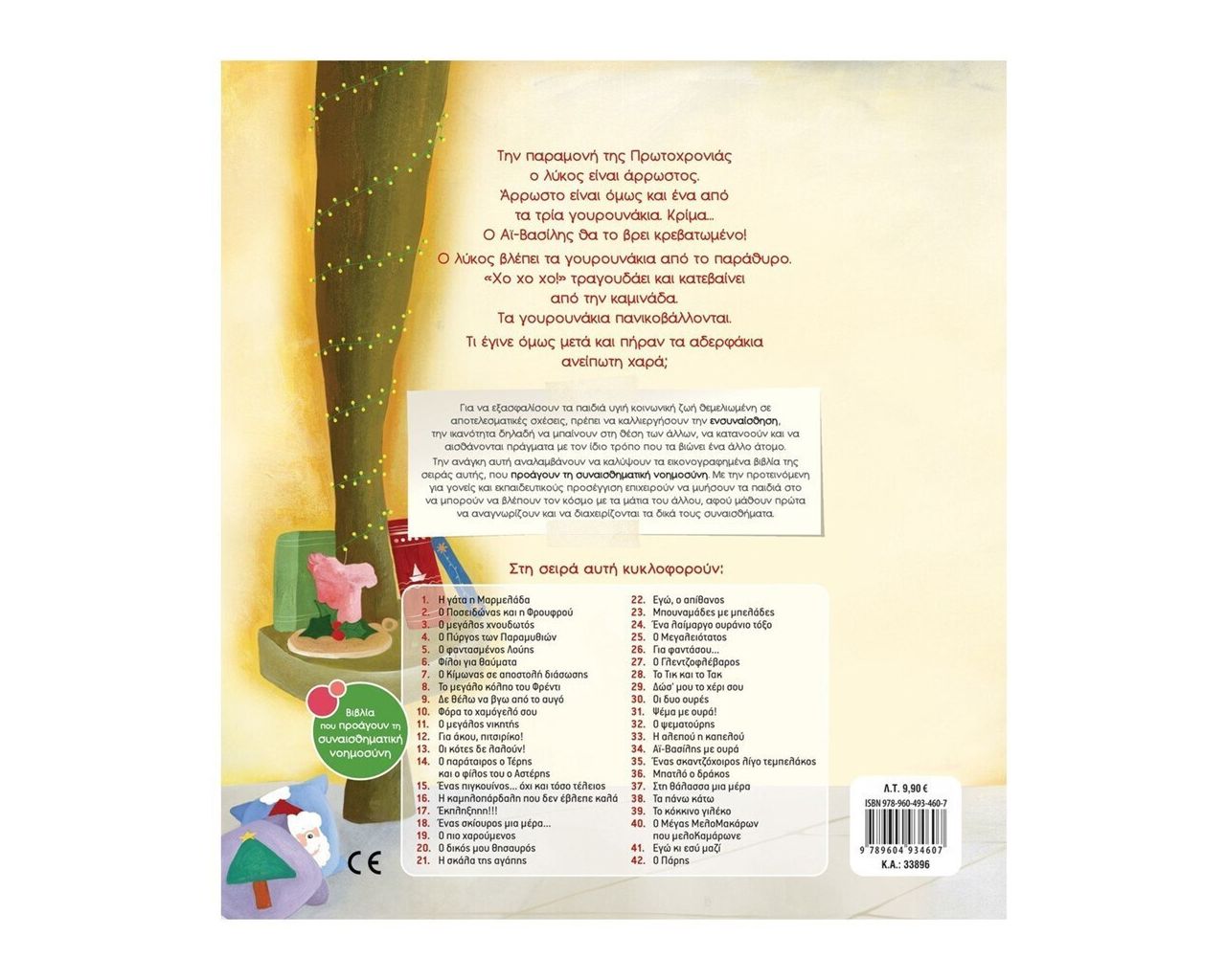 Το βιβλίο: Την παραμονή της Πρωτοχρονιάς ο λύκος είναι άρρωστος. Άρρωστο είναι όμως και ένα από τα τρία γουρουνάκια. Κρίμα… Ο Αϊ-Βασίλης θα το βρει κρεβατωμένο! Ο λύκος βλέπει τα γουρουνάκια από το παράθυρο. «Χο χο χο!» τραγουδάει και κατεβαίνει από την καμινάδα. Τα γουρουνάκια πανικοβάλλονται. Τι έγινε όμως μετά και πήραν τα αδερφάκια ανείπωτη χαρά;